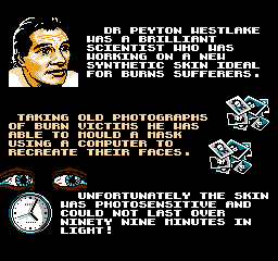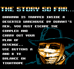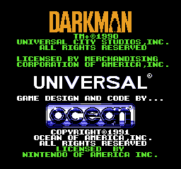 《变形黑侠/蒙面人》(Darkman) 根据同名影视改编的FC游戏,还是非常还原原作的。游戏操作较为复杂,每一关之前主角都会变成跟本关总BOSS一样的人,过关后还有照相或者吃金币的小游戏,看过本片的人会发现这些小游戏其实跟影片本身也有很大关系,总体来说游戏性很强,同时游戏难度也较大,在当时很少有人能够通关。