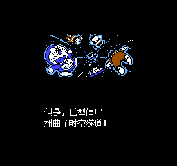 哆啦A梦:超时空历险 (Doraemon – Giga Zombie no Gyakushuu) 原作为1990年在日本发售的回合制战斗RPG,时间线主要发生在各大长篇的后面,背景是《日本诞生》的反派巨尊比再度燃起控制世界的野心,将被哆啦A梦一行人打败过的大长篇反派们再度复活,而哆啦A梦一行为了阻止他前往远古时代的时候被巨尊比扭曲了时空,只有哆啦A梦一人回到了原本的城镇,并找到了作为原创主人公的玩家,一起前往各个时空,救出分散的同伴并打败复活的反派们。