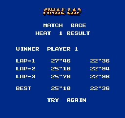 《最后冲刺》(Final Lap) 一款FC平台的游戏作品。复古的游戏画风,FC游戏特有的操作感,都让人瞬间回忆起当年玩游戏时的快乐。相比现在华丽的游戏,虽然游戏内容比较简单、单调,但对于喜爱FC游戏的伙伴们试玩倒是个不错的选择,很不错的怀旧游戏,值得推荐,希望大家好好享受游戏带来的快乐。