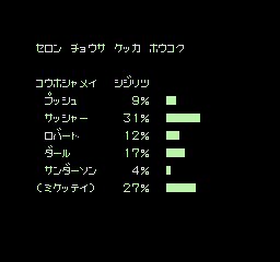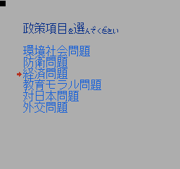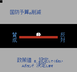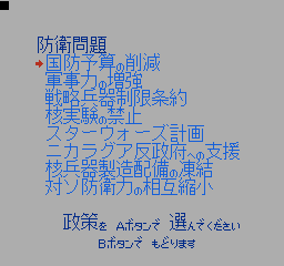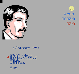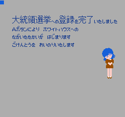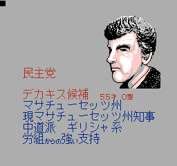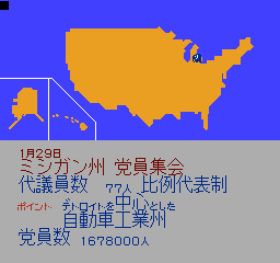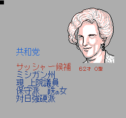 美国总统大选 (America Daitouryou Senkyo) 作为一款SLG游戏,这部作品模拟的是1988年的美国总统大选活动;玩家要从民主与共和两党各三名,共六名或是影射实际欧美政治人物,甚至架空的日裔参选者当中择一,首先从党内初选阶段开始过关斩将,力求在党代表大会上获得提名,再投入全国选战,争取各州选举人票以赢得美国总统选战。