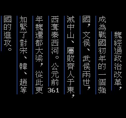 战国群雄传 (The Hero of the Warring States) 魏经过政治改革,成为战国初年的一个强国,文後、武侯两世,灭中山、屡败齐人于东,西夺秦西河。公元前361年魏边都大梁,从此更加紧了对宋、韩、赵等国的进攻。