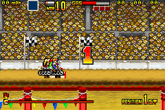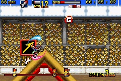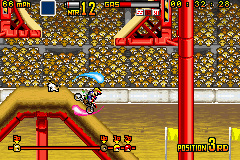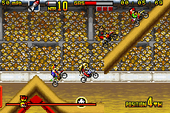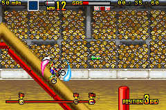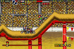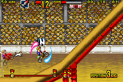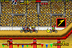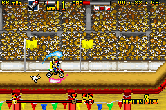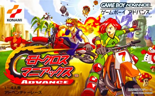 《疯狂越野摩托车》(Motocross Maniacs Advance) 游戏可以说是FC和GB上那款越野摩托车的进化版,游戏画面当然漂亮了不少,比赛中的人物也都有了自己的造型,游戏方式与之前倒是没什么变化,同样是在横版卷轴里翻越障碍做出各种特技。