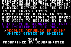 乒乓外交 (Ping-Pong Diplomacy Advance) 一款GBA乒乓球游戏。游戏由C语言编写。是GB乒乓外交的复刻版。对于喜爱PSP游戏的伙伴们试玩倒是个不错的选择,很不错的怀旧游戏,希望大家好好享受游戏带来的快乐。