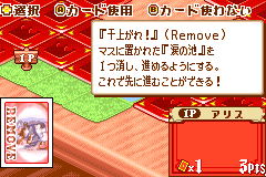 爱丽丝梦游仙境 (Fushigi no Kuni no Alice) 著名卡通小说“爱莉丝游仙境”的GBA版,蛮简单的设定,轻快的卡片游戏。战略性不高,但闲时轻松一下倒是推荐。但是在怀旧之余轻松一下心情也不错。很不错的怀旧游戏。