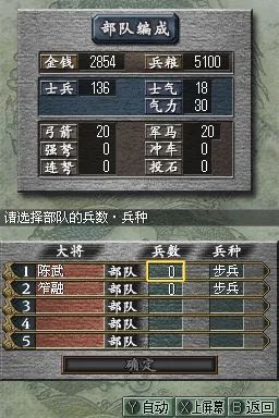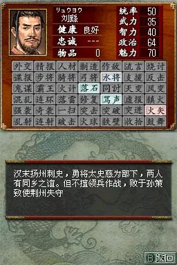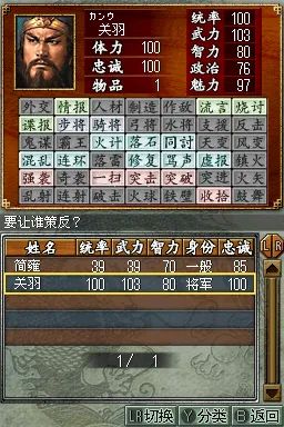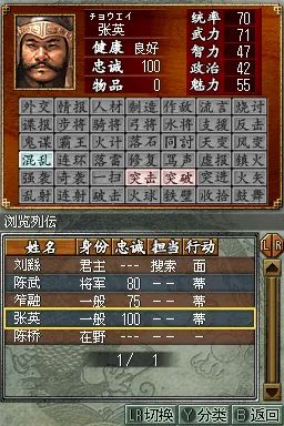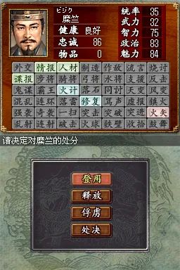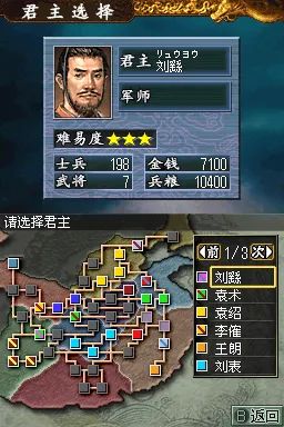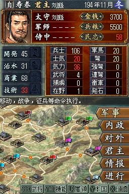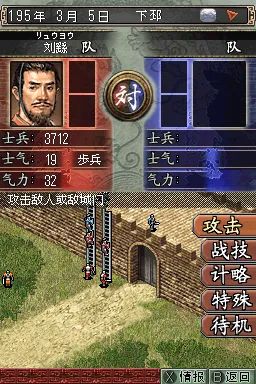 三国志DS2 (Sangokushi DS 2) 是一款专为 NDS 平台打造的策略模拟游戏,延续了系列经典玩法,同时融入创新元素,为玩家带来沉浸式的三国争霸体验。在游戏中,玩家将扮演主公,从众多势力中选择一方,如曹操、刘备、孙权等,通过内政、外交、军事等手段,逐步实现统一三国的霸业。内政方面,需合理分配资源,发展城市,提升人口、农业、商业等各项指标;外交上,可与其他势力结盟、联姻或离间,巧妙周旋于复杂的局势之中;军事上,组建强大的军队,招募名将,制定战略战术,指挥士兵攻城略地。战斗环节采用即时战略模式,利用 NDS 的双屏特性,上屏显示战场全局,下屏进行部队操作,玩家可灵活调整阵型,利用兵种相克原理,如骑兵克制步兵,弓兵克制骑兵,在战场上克敌制胜。