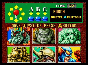 怪兽之王1 (King of the Monsters) 本质上是一个摔跤游戏,只不过主角换成了各种怪兽,背景换成了颇具特摄意味的城市场景。与其他摔角游戏相类似,在耗光敌人血条后要至少使用两次终结技才能结束战斗。虽然怪物的名字都是虚构的,但其造型很难不让人想起日本传统特摄片中的怪兽,如哥斯拉、加美拉、金刚等等。