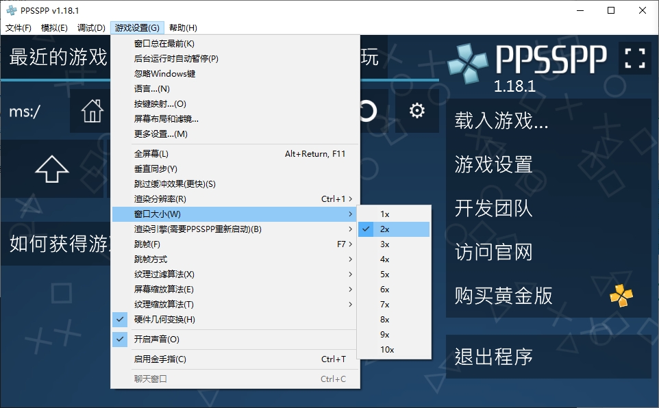 操作步骤:游戏设置 → 窗口大小 → 2x(推荐 2 倍大小)